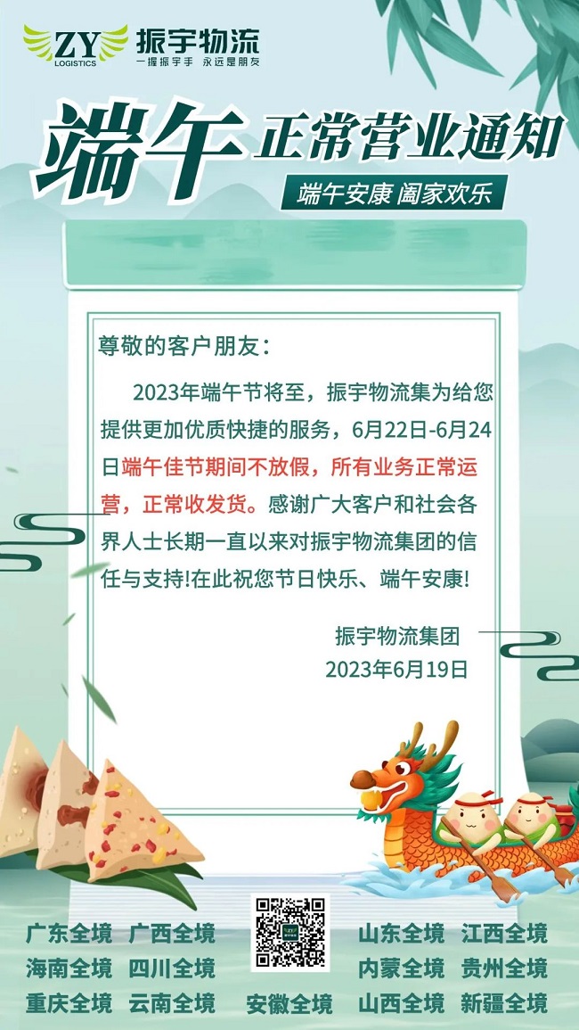 2023年端午節将至,振宇物流集爲給您提供更加優質快捷的服務,6月22日-6月24日端午佳節期間不放假,所有業務正常運營,正常收發(fā)貨(huò)。感謝廣大客戶和社會各界人士長期一直以來對振宇物流集團的信任與支持!在此祝您節日快樂、端午安康!