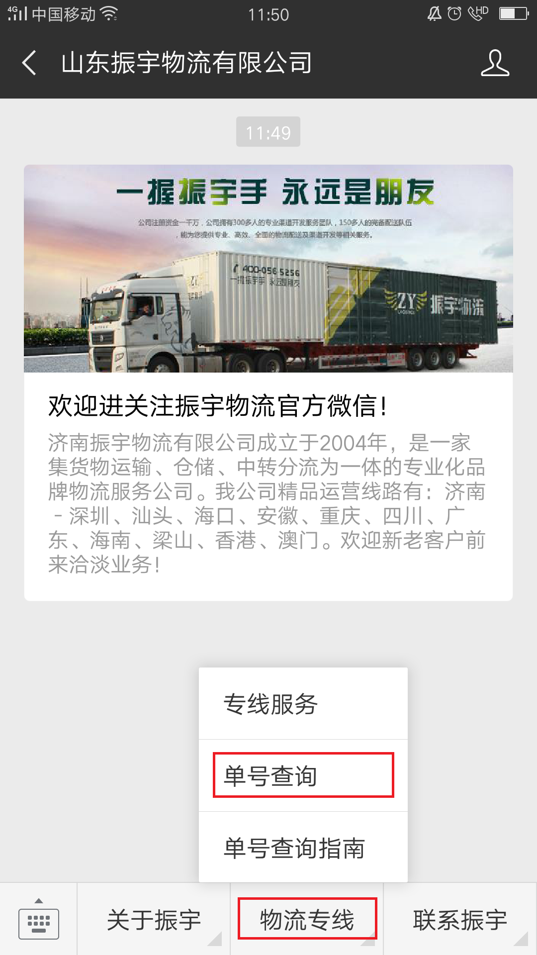 3.進入公衆号,點擊“物流專線(xiàn)——單(dān)号查詢”欄目。