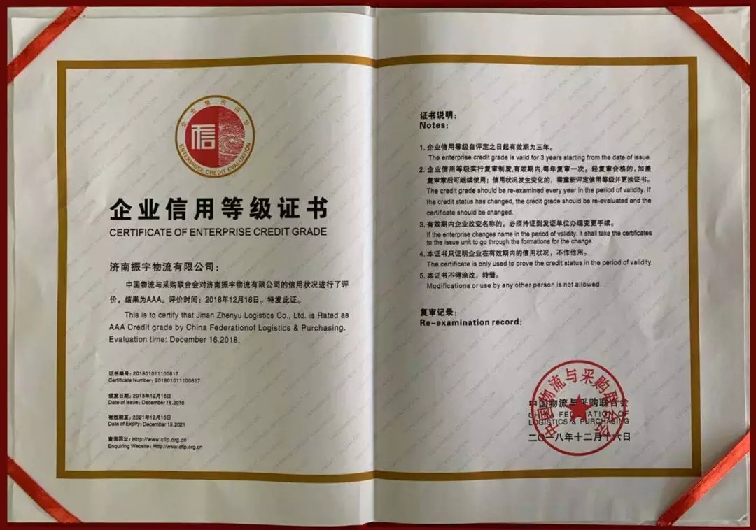 濟南振宇物流有限公司:國家3A級信用企業